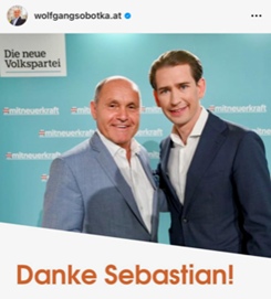 So wurde im September 2022 ein Interview Sobotkas mit der „Kronen Zeitung“ beworben, das den Titel „Sobotka über ‚Genossen‘“ trägt,[20] was wohl einer sicherlich nicht positiv gemeinten Anspielung auf die SPÖ entspricht und schon dadurch die für den Nationalratspräsidenten unverzichtbare Überparteilichkeit vermissen lässt. Eindeutig parteipolitisch zu verorten ist ein beworbenes Instagram-Posting vom 2. Dezember 2021, das ein vor einer Werbewand mit dem Emblem „Die neue Volkspartei“ aufgenommenes Foto Sobotkas an der Seite von Ex-Bundeskanzler Sebastian Kurz und den Schriftzug „Danke Sebastian!“ zeigt.[21] Der Begleittext zum Foto lautet: