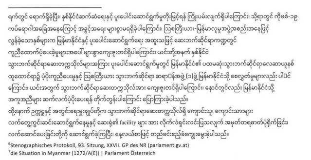 Am 26.03.2021 wird auch folgender Entschließungsantrag der Regierungsparteien einstimmig angenommen: „Die Bundesregierung, insbesondere der Bundesminister für europäische und internationale Angelegenheiten, wird ersucht, den Coup in Myanmar zu verurteilen und sich für eine unabhängige internationale Untersuchung der Vorgänge, insbesondere in menschenrechtlicher Hinsicht, einzusetzen. Die Bundesregierung, insbesondere der Bundesminister für europäische und internationale Angelegenheiten, wird ersucht, sich gemeinsam im Verbund mit den EU-Partnern für eine Freilassung der festgenommenen Politiker*innen und Vertreter*innen der Zivilgesellschaft in Myanmar, eine Rückkehr zum demokratischen Prozess und eine Wiederherstellung der Zivilregierung einzusetzen. Weiters wird die Bundesregierung ersucht, die österreichischen Anstrengungen im Hinblick auf die Verbesserung der Situation der Rohingya fortzusetzen."7