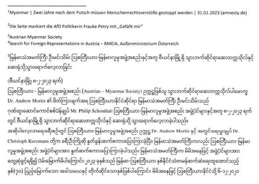 Die offizielle Facebookseite der „Myanmar Embassy and Permanent Mission Vienna"2, postet am 08.02.2023, also in zeitlicher Nähe zum Jahrestag des Militärputsches, über den Besuch des „Botschafters" Myanmars U Min Thein in der Universitätszahnklink Wien, einer Tochtergesellschaft der Medizinischen Universität Wien, auf Einladung von Univ. Prof. DDr. Andreas Moritz, dem Geschäftsführer der Universitätszahnklinik Wien GmbH, welcher auch Präsident der Austrian Myanmar Society3 ist. Bei dem Treffen waren auch Mag. Philip Schönthal, Vizepräsident der Austrian Myanmar Society und Honorarkonsul Myanmars in Österreich4 und Dr. Christoph Kurzmann, Generalsekretär der Austrian Myanmar Society und Leiter der Spezialambulanz Digitale Zahnheilkunde der Universitätszahnklinik, anwesend. Es wurde hervorgehoben, dass die diplomatischen Beziehungen im heurigen Jahr seit 70 Jahren bestehen und die ausgezeichnete Zusammenarbeit, vor allem im medizinischen Bereich, betont und sich für die künftige weitere Unterstützung bedankt.5 Auf der Facebook Seite des Ministry of Foreign Affairs Myanmar (@mofamyanmar) wurde der Beitrag am 09.02.2023 um 04:58 Uhr ebenfalls geteilt.