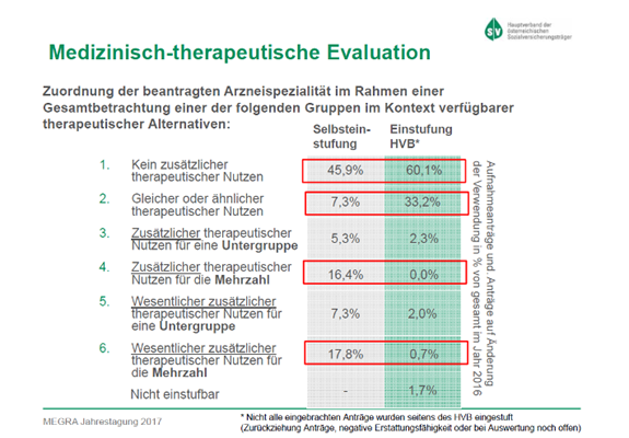 Auch bei abgedeckten Arzneimitteln stellt sich aber immer wieder die Frage, welchen Nutzen die Regelungen des EKO in den Vordergrund stellen. So gibt es häufig unterschiedliche Einschätzungen von Patientennutzen und divergierende Ansichten der Industrie und der Heilmittel-Evaluierungs-Kommission (HEK), welche neuen Produkte einen höheren Nutzen erfüllen und welche für eine Neuzulassung eine Preisreduktion anzubieten zu haben. Dies zeigt sich auch an den unterschiedlichen Angaben zur medizinisch-therapeutischen Evaluation, bei denen die HEK den neuen Nutzen für Patienten oft geringer einschätzt, als Produzenten dies selbst tun. Das ist zwar ein erwartbares Ergebnis, allerdings wird nicht erklärt, wie die HEK zu ihren Einschätzungen kommt.