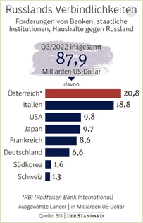Das Russland-Geschäft der Raika rückt Österreich insgesamt in ein schlechtes Bild. Die Statistik über die russischen Kreditverbindlichkeiten als Gradmesser für die Intensität des Bankgeschäfts führt Österreich klar an.