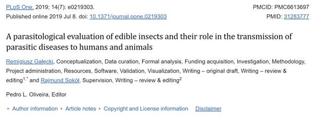 Aufsehen erregt in dem Zusammenhang eine Studie[2] mit dem Titel „Eine parasitologische Bewertung von essbaren Insekten und ihrer Rolle bei der Übertragung von parasitären Krankheiten auf Mensch und Tier“: