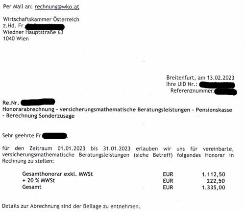 All die Dementi aus der Kammer passen aber nicht mit der Realität zusammen. Denn eine nunmehr bekannt gewordene Honorarnote (4) vom 13. Februar 2023 belegt, dass die WKO auch nach dem Auffliegen der Causa Luxuspensionen am 17. Jänner 2023 noch Berechnungen zu Pensionskassenzahlungen erstellen hat lassen.