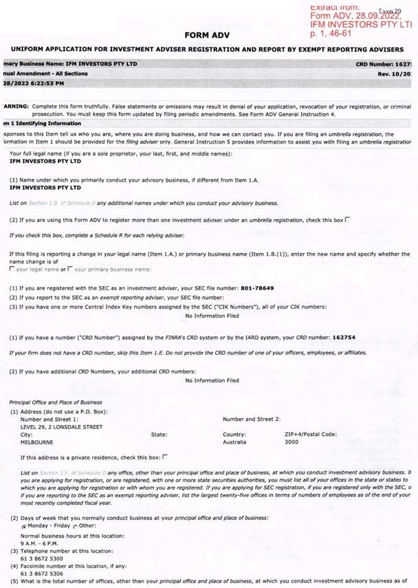 Beilage ./1: Auszug aus dem von IFM Investors Pty Limited ausgefüllten ADV-Form der SEC (S. 1 sowie 46-61)