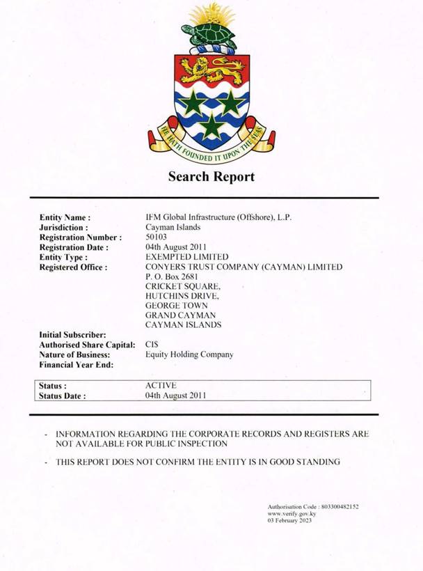 Beilage ./2: Search Report (Suchbericht) vom 03.02.2023 aus dem Firmenregister der Cayman Islands zum Feeder Fund IFM Global Infrastructure (Offshore), L.P.