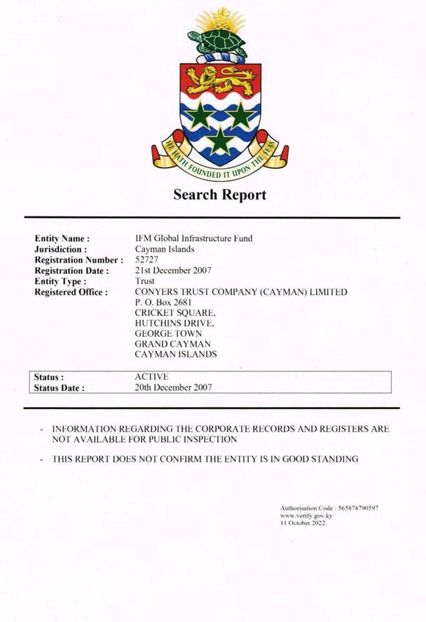 Beilage ./3: Search Report (Suchbericht) vom 11.10.2022 aus dem Firmenregister der Cayman Islands zum IFM Global Infrastructure Fund (Cayman Islands)