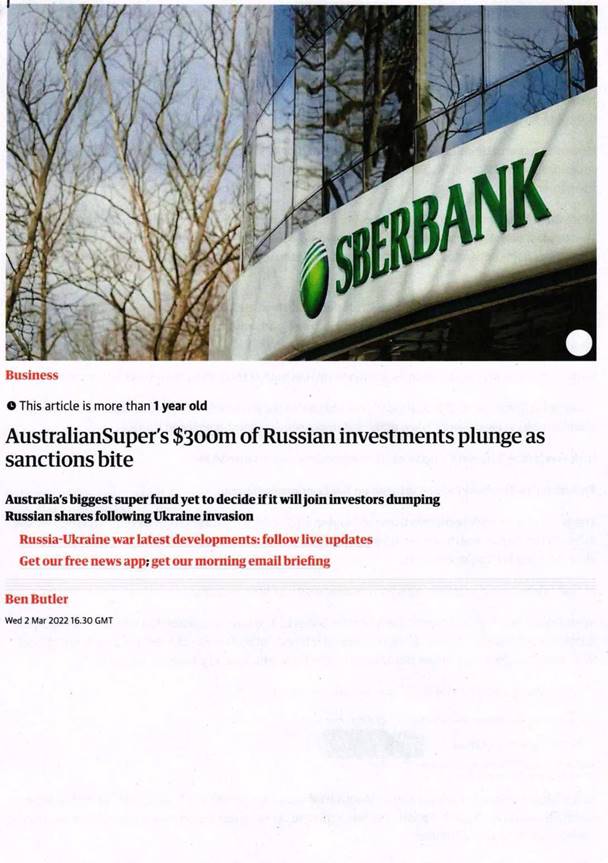 Beilage ./4: „Guardian“ vom 02.03.2022 mit dem Titel “AustralianSuper’s $300m of Russian investments plunge as sanctions bite”