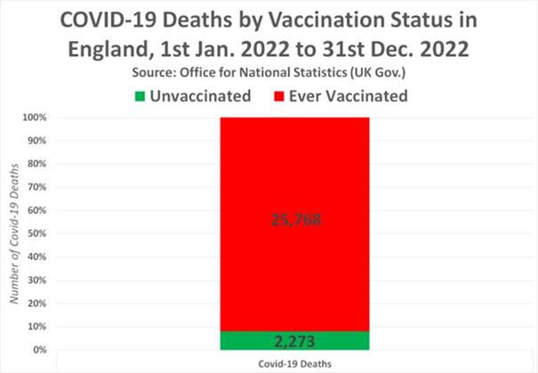 Mittlerweile ist bekannt, dass die Corona-Impfungen weder vor Ansteckungen, noch vor der Weitergabe des Virus‘, noch vor leichten und schweren Verläufen, noch vor Todesfällen schützt! Sie können allerdings diverse Nebenwirkungen haben. Aktuelle Zahlen der britischen Gesundheitsbehörde zeigen, dass 2022 in England 91,89 % der an Corona verstorbenen geimpfte Personen waren, siehe nachfolgende Grafik!