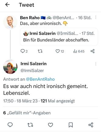 Der Tweet wurde von der Vize-Kabinettschefin später wieder gelöscht. Neben dem Ursprungs-Tweet ist aber auch ein eindeutiger Beweis dafür erhalten, dass Salzer diese verfassungsfeindliche Aussage keinesfalls als Scherz, Satire oder überspitzte Meinung postete. Denn auf den Verdacht eines anderen Twitter-Nutzers hin, wonach die Aussage ironisch gemeint wäre, postete Salzer, dass die Forderung nach einer Abschaffung der verfassungsmäßig verankerten Bundesländer nicht ironisch gemeint war, sondern ihr „Lebensziel“ darstelle: