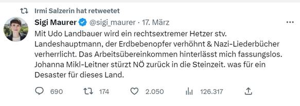 Mit nicht minder skandalösem Verhalten glänzte nun (abermals) die Vize-Kabinettschefin von Bundesministerin Gewessler, Irmi Salzer. Auf der Social-Media-Plattform Twitter forderte sie auf ihrem Kanal, für die Öffentlichkeit einsehbar, die „Abschaffung der Bundesländer“ in Österreich, offenbar weil sie mit dem Wahlergebnis der Landtagswahl in Niederösterreich und der daraus entstandenen Koalition zwischen ÖVP und FPÖ nicht einverstanden war. Wörtlich schrieb Salzer am 18. März 2023: