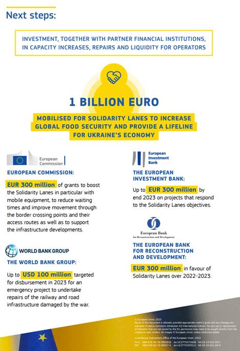 Die Europäische Kommission arbeitet seit Mai 2022 im Rahmen eines Aktionsplanes mit Mitgliedstaaten, ukrainischen Behörden, Transportunternehmen und anderen relevanten Akteuren auf beiden Seiten zusammen, um alternative Logistikrouten zu optimieren: die „EU-Ukraine Solidarity Lanes“.