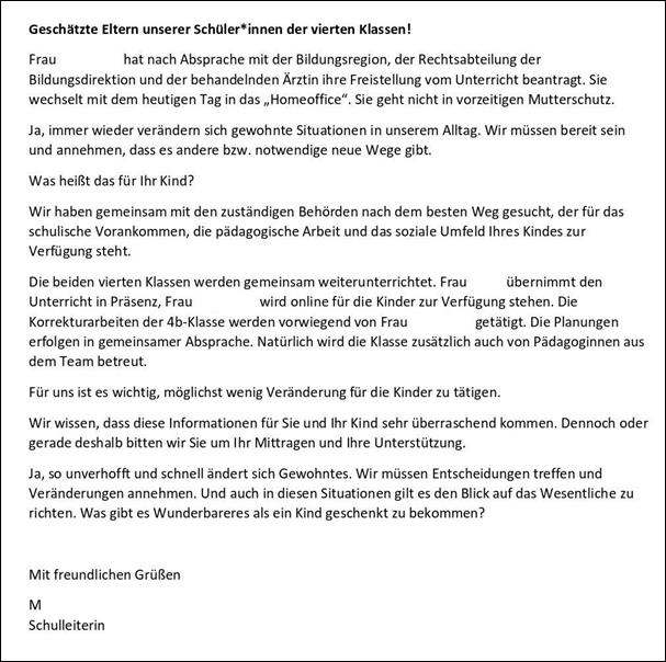 Bei Ende des letzten Wintersemesters verschickte eine oö. Schulleiterin an die Eltern ihrer Schüler einen Brief, der im Folgenden anonymisiert wiedergegeben wird: