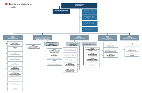 In Entsprechung des auf der Homepage des Bundesministeriums für Justiz veröffentlichten Organigramms1 (Stand Februar 2023) ist das BMJ unter der Frau Bundesministerin und deren Kabinett sowie vier Stabsstellen in fünf Sektionen gegliedert, welche ihrerseits in Abteilungen untergliedert sind. Dabei fällt auf, dass in der Sektion I (Zivilrecht) bei fünf von zehn Abteilungsleiter:innenpositionen nur "N.N." (nomen nominandum) steht und diese wichtigen Positionen damit also unbesetzt sind. Hier stellt sich die Frage, wieso?