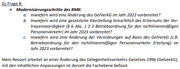 Diese AB weist also nach, dass die Wirtschaftskammer Wien bei insgesamt 3.788 Antritten zur Taxilenkerprüfung im Jahr 2022 alleine in Wien satte EUR 652.672,40 als Körberlgeld verdient hat. (2) Ebendiese Anfrage hat auch die Taxilenkerausweise erfragt, nämlich inwiefern das Ministerium eine gesetzliche Klarstellung hinsichtlich des Kriteriums der Vertrauenswürdigkeit (§ 6 Abs. 1 Z 3 Betriebsordnung für den nichtlinienmäßigen Personenverkehr BO 1994) vorbereitet. Aus der Beantwortung der Anfrage geht folgendes hervor: "Mein Ressort arbeitet an einer Änderung des Gelegenheitsverkehrs-Gesetzes 1996 (GelverkG); mit den inhaltlichen Anpassungen ist derzeit die Fachebene befasst." (3)
