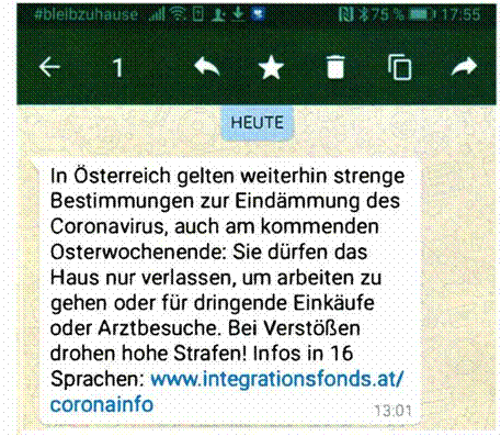 Hierbei handelt es sich nachweislich um lediglich einen Teil der offiziell erlaubten Gründe, das Haus zu verlassen - es handelt sich also um Halbinformation von Seiten einer offziellen Stelle, nämlich des ÖIF, in Kombination mit der Androhung "hoher Strafen!“. Sie selbst haben laut APA-Meldung vom 27. März 2020 eine "Offensive gegen Fake News für Migranten" gestartet, die die Verbreitung von Falsch-Nachrichten und sog. Corona-Mythen unter Migrant_innen verhindern soll. Im Zuge dieser Kampagne seien laut Ihren Angaben am 27. März 2020 "bereits mehr als 260.000 Menschen via SMS, Mail und online kontaktiert" worden.1 Es stellt sich nun die Frage, ob diese Nachricht Teil der sog. Informationskampagne ist.