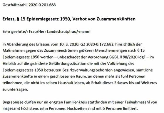 Dieser Erlass auf Grundlage von § 15 Epidemiegesetz 1950 betreffend "Verbot von Zusammenkünften" mit der Geschäftszahl: 2020-0.201.688 vom 1. April 2020 wurde ohne größere Ankündigung oder weitere Erklärung auf der Homepage des Gesundheitsministeriums https://www.sozialministerium.at/lnformationen-zum-Coronavirus/Coronavirus---Rechtliches.html veröffentlicht.