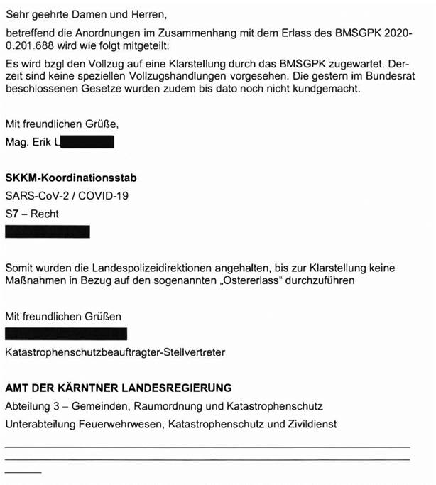 Folgende Korrespondenz vom StV Kärntner Katastrophenschutzbeauftragten, weitergeleitet an diverse andere Empfänger im Land, enthält eine Information von Mag. Erik L., seineszeichens Beamter des Innenministeriums in der Sektion 7 (Fachbereich Recht) und Angehöriger des SKKM-Stab des Innnenministeriums, wirft einige Fragen zur allgemeinen Behördenkoordination in Bezug auf den "Ostererlass" auf.