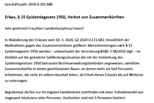Dieser Erlass auf Grundlage von § 15 Epidemiegesetz 1950 betreffend "Verbot von Zusammenkünften" mit der Geschäftszahl: 2020-0.201.688 vom 1. April 2020 wurde ohne größere Ankündigung oder weitere Erklärung auf der Homepage des Gesundheitsministeriums https://www.sozialministerium.at/lnformationen-zum-Coronavirus/Coronavirus---Rechtliches.html veröffentlicht.