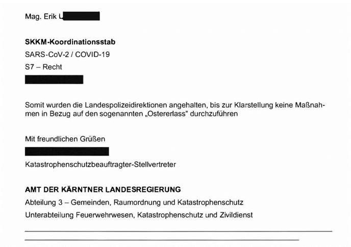 Folgende Korrespondenz vom StV Kärntner Katastrophenschutzbeauftragten, weitergeleitet an diverse andere Empfänger im Land, enthält eine Information von Mag. Erik L., seineszeichens Beamter des Innenministeriums in der Sektion 7 (Fachbereich Recht) und Angehöriger des SKKM-Stab des Innnenministeriums, die einige Fragen zur allgemeinen Behördenkoordination in Bezug auf den "Ostererlass" aufwirft.