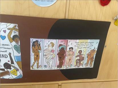 Ein Twitter-Nutzer hat eine Abbildung aus dem Betriebskindergarten des ORF „geleakt“.[1] Die Abbildung soll einem Buch entstammen, das bei sogenannten Dragqueen-Lesungen verwendet werden soll. Darauf sind mehrere Menschen, die meisten davon mit dunkler Hautfarbe, beim Duschen zu sehen. Eine Person ist sowohl mit weiblichen als auch männlichen Geschlechtsattributen abgebildet und verfügt demnach über weibliche Brüste und einen Penis.