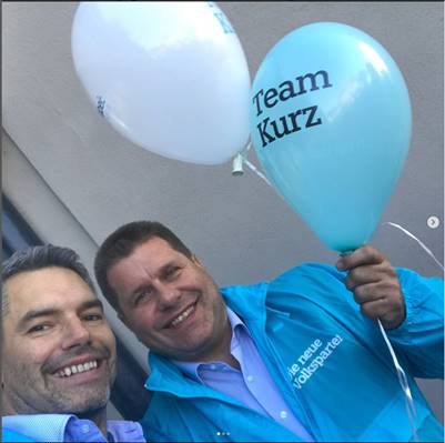 (Foto: Nehammer, Takacs, zwei türkise Luftballons; Quelle: Twitter)
