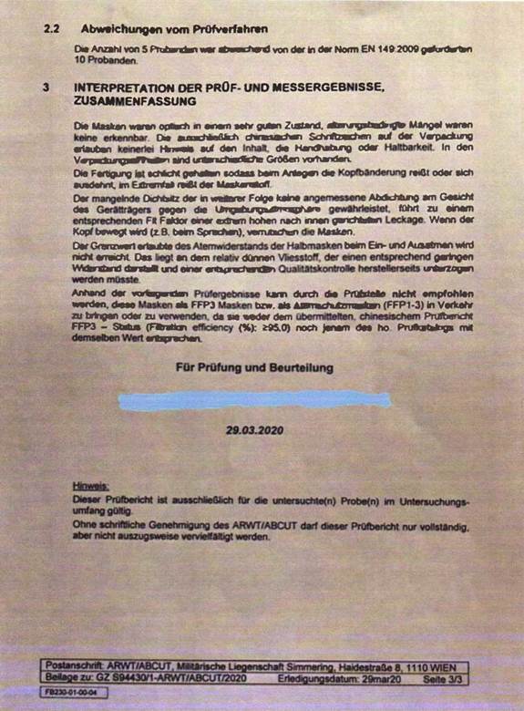 Nach Recherchen des Radiosenders Ö1[4] handelt es dabei um 100.000 Stück angeblicher FFP2- Masken, die jedoch nur äußerst mangelhaften Schutz bieten.