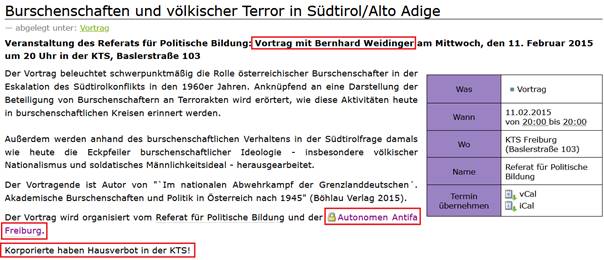 Weidingers Kontakte ins gewaltbereite Antifa-Lager sind belegt. Noch 2015 hielt er in Freiburg einen Vortrag zum Thema „Burschenschaften und völkischer Terror in Südtirol/Alto Adige“,[7] der vom Referat für politische Bildung des linksextrem dominierten Studierendenrats der Uni Freiburg zusammen mit der über die Grenzen Baden-Württembergs hinaus als besonders militant und extremistisch bekannten „Autonomen Antifa Freiburg“ organisiert wurde, welche trotz der gegenüber dem Linksextremismus besonders laxen Haltung des deutschen Verfassungsschutzes unter dessen Beobachtung steht.