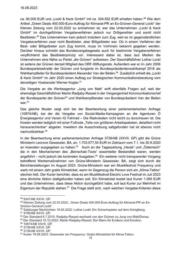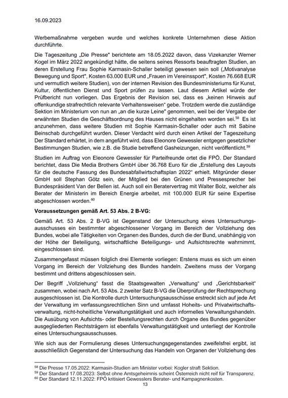 "Die österreichische Bundespolitik steht seit längerer Zeit in der Kritik, wonach das Handeln vieler Spitzenpolitikerinnen und -politiker auf Bundesebene überwiegend den Interessen von Parteien und ihren Mitgliedern diene und nicht dem Interesse der Allgemeinheit", heißt es auf den 14 Seiten, die dem STANDARD vorliegen. "Im Besonderen lautet der Vorwurf, dass bei der Vergabe von Inseraten oder bei der Beauftragung von Gutachten, Studien und Umfragen nicht Rechtsrichtigkeit, Sparsamkeit, Wirtschaftlichkeit und Zweckmäßigkeit, sondern das Naheverhältnis zu einer politischen Partei die ausschlaggebende Rolle gespielt habe."