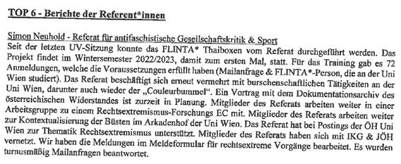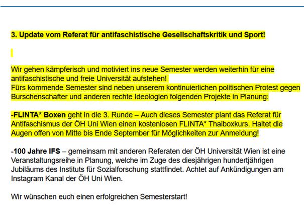[1] Antifaschistische Gesellschaftskritik und Sport - ÖH Uni Wien (univie.ac.at) sowie Couleur-Verbot: Rektor der Uni Wien lehnt ÖH-Beschluss ab | Tiroler Tageszeitung – Aktuelle Nachrichten auf tt.com