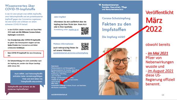 Da BASG unter das BMSGPK, und damit auch unter dasselbe Bundesministerium, welches den Folder rausgegeben hat, gehört, ist davon auszugehen, dass die Zuständigen die Informationen über die Nebenwirkungen (und damit einer breiten Palette an Krankheiten, welche durch die Impfstoffe verursacht wurden) hatten oder haben müssen. Falls sie diese nicht hatten (= haben sich nicht informiert), war/ist es fahrlässig.
