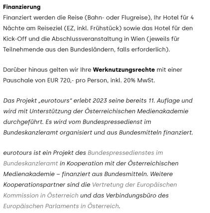 Das vom Bundeskanzleramt betreute und aus Bundesmitteln finanzierte Journalisten-Programm „eurotours“ fand im Sommer 2023 bereits zum elften Mal statt. Ziel dieses Projektes ist es, angehenden Journalisten bis zu fünftägige Aufenthalte in EU-Mitgliedsstaaten sowie den sechs „Balkan-Staaten“ zu finanzieren. Als Gegenleistung müssen diese lediglich zu einem vom BKA vorgegebenen Thema recherchieren. Die Ergebnisse bzw. Zusammenfassungen dieser Recherchen werden folglich auf einem wenig reichweitenstarken „X“-Account (402 Follower, Stand 09.10.2023), einem Blog sowie den jeweiligen Medien der Nachwuchsjournalisten und der Webseite des BKA veröffentlicht.