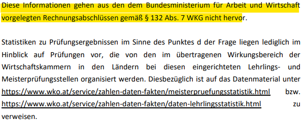 Rund zwei Monate später offenbarte Martin Kocher, Bundesminister für Arbeit und Wirtschaft zu den gestellten Fragen rund um die Einnahmen der Wirtschaftskammern aus Prüfungen, Kursen zur Vorbereitung auf Prüfungen und Nachprüfungen in der Anfrage-Beantwortung 15345/AB Folgendes: