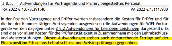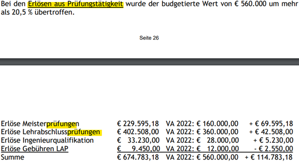 Entgegen der Antwort, dass diese Informationen nicht vorliegen würden, hat die Wirtschaftskammer Vorarlberg jedoch in ihrem Rechnungsabschluss 2022 die Einnahmen aus Prüfungen sehr wohl offengelegt: