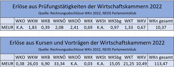 Eigene Berechnungen anhand der Rechnungsabschlüsse der einzelnen Wirtschaftskammern ergeben folgende Einnahmen aus Prüfungen sowie aus Kursen und Vorträgen der Wirtschaftskammern, wobei eine klare Differenzierung zwischen Einnahmen aus Kursen und Einnahmen aus Vorträgen seitens den Wirtschaftskammern nicht vorgenommen wurde und einzelne Summen (mit K.A. gekennzeichnet) nicht klar aus den Rechnungsabschlüssen hervorgehen: