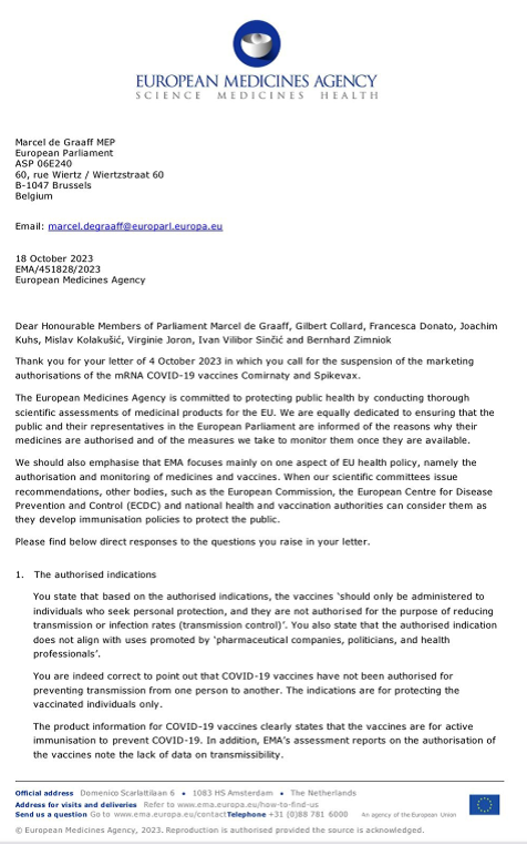 Die EMA schrieb im offiziellem Schreiben an den niederländischen EU-Abgeordneten Marcel de Graaff, „dass Covid-19-Impfstoffe nicht zugelassen sind, um die Übertragung von einer Person auf eine andere zu verhindern. Die Indikationen dienen nur zum Schutz der geimpften Personen“.