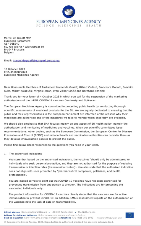 Die EMA schrieb im offiziellem Schreiben an den niederländischen EU-Abgeordneten Marcel de Graaff, „dass Covid-19-Impfstoffe nicht zugelassen sind, um die Übertragung von einer Person auf eine andere zu verhindern. Die Indikationen dienen nur zum Schutz der geimpften Personen“.
