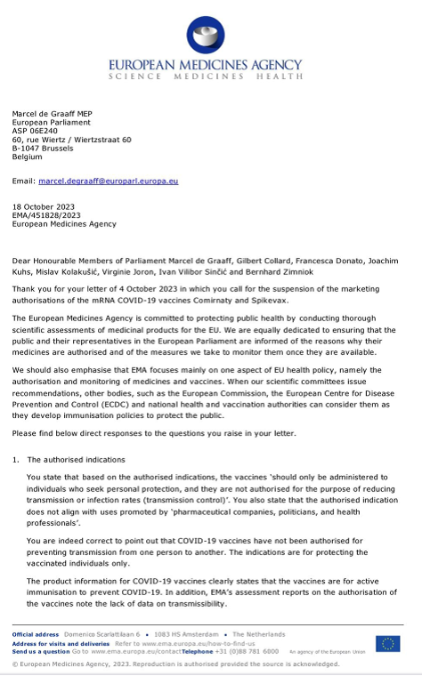 Die EMA schrieb im offiziellem Schreiben an den niederländischen EU-Abgeordneten Marcel de Graaff, „dass Covid-19-Impfstoffe nicht zugelassen sind, um die Übertragung von einer Person auf eine andere zu verhindern. Die Indikationen dienen nur zum Schutz der geimpften Personen“.