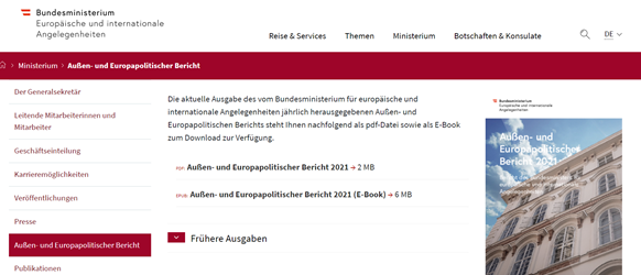 Transparenz ist die Grundlage für die parlamentarische Kontrolle der Regierung durch die gewählte Volksvertretung. Die regelmäßige Veröffentlichung der Arbeit der Ministerien ist daher grundlegend für den Parlamentarismus. Das BMEIA veröffentlicht den Außen- und Europapolitischen Bericht, der die Arbeit und die Einschätzungen der Diplomat:innen und Mitarbeiter:innen des BMEIA zur politischen Weltlage darstellt. Der Bericht wird alljährlich heiß erwartet und steht unmittelbar nach seiner Veröffentlichung im Zentrum der Debatte im Außenpolitischen Ausschuss.