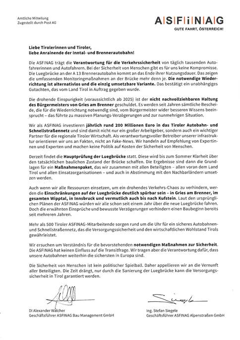 In der Kalenderwoche 15 erreichte die Tiroler Haushalte das nachstehende, durch die Post AG verteilte und als „Amtliche Mitteilung“ bezeichnete Schreiben der ASFINAG, in dem dem Bürgermeister der Gemeinde Gries am Brenner die Schuld dafür gegeben wird, dass auf der Luegbrücke (A13 Brennerautobahn) ab 2025 eine einspurige Verkehrsführung droht. Weiters wird dem Bürgermeister vorgeworfen, dass er seit Jahren wider besseres Wissen sämtliche Bescheide beeinspruchen würde, welche für die Wiedererrichtung der Lueg-Brücke notwendig sind. Das Schreiben ist von den Herren Dipl. Ing. Alexander Walcher, Geschäftsführer der ASFINAG Bau Management GmbH, und Ing. Stefan Siegele, Geschäftsführer der ASFINAG Alpenstraßen GmbH unterzeichnet. (siehe Dokument im Anhang)
