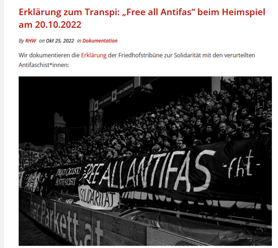 In diesem Zusammenhang rief die „Rote Hilfe“ u.a. bei einem Spiel des Fußballklubs „Wiener Sportclub“ auch zur Freilassung inhaftierter Linksterroristen auf: