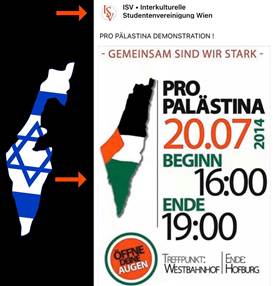 Kein Wunder daher, dass auf der Facebook-Seite der ISV mehrere Aufrufe zur Teilnahme an einer Pro-Palästina-Demo zu finden sind. Auf dem Sujet, mit dem für die Veranstaltung geworben wurde, wurde Israel von der Landkarte ausgelöscht und durch Palästina ersetzt. Bei der folgenden Demonstration kam es zu mehreren antisemitischen Vorfällen.