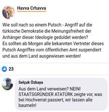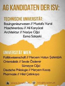 Auch auf den privaten Accounts der ISV-Funktionäre ist Israels Politik ein zentrales Thema. Meryem Hatun Sahintürk (heute Meryem Tasdelen), die für die ÖVP-nahe Aktionsgemeinschaft (AG) kandidierte, postet auf ihrer Facebook-Seite verhetzende Anti-Israel-Propaganda und verharmlost mehrere dschihadistische Gruppierungen, unter anderem Al-Kaida, als „angebliche Islamisten“. Eines ihrer Profilbilder auf Facebook ist das R4bia-Symbol, was gemeinhin der Muslimbruderschaft zugeschrieben wird. Unter einem Facebook-Posting, im Zusammenhang mit dem versuchten Türkeiputsch, ruft eine andere AG-Aktivistin Namens Havva Crhavva auf, die Meinungsfreiheit der Oppositionellen einzuschränken. Darunter findet sich ein seit Jahren ungelöschter Aufruf die Putschisten zu töten.
