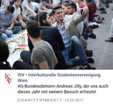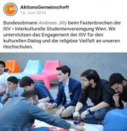 Im Jahr 2016 hielt der damalige AG-Bundesobmann und jetzige Pressesprecher von Finanzminister Gernot Blümel, Andreas Jilly, eine Rede bei einem islamischen Iftar-Fest der ISV. Kurz darauf gab die AG auf Facebook abermals bekannt das Engagement des ISV an österreichischen Hochschulen zu unterstützen. Auffallend ist auch die religiös motivierte Geschlechtertrennung bei der ISV. Auf allen veröffentlichten Fotos sind Frauen und Männer klar getrennt. Wie mehrere Fotos belegen war dies auch bei Jillys Auftritt eindeutig der Fall - dieser sitzt strikt isoliert mit der Männer-Gruppe unter sich, abseits der der Frauen. Jilly sorgte bereits 2017 für mediale Aufmerksamkeit, als es unter seiner Obmannschaft zum AG-Jus-Skandal kam, bei welchem sich AG-Funktionäre in WhatsApp- und Facebook-Gruppen über den Holocaust lustig machten.6