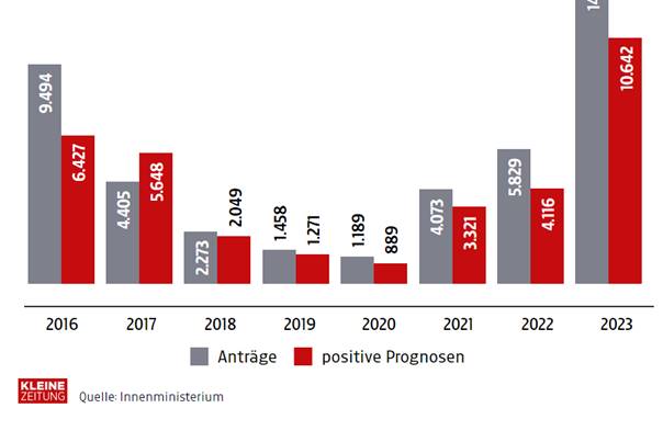 Während es in den Jahren 2021 und 2022 noch etwas weniger als 3300 bzw. 4100 Personen waren, wurden im Vorjahr mehr als 10.600 Personen nachgeholt (siehe Grafik). Eine enorme Steigerung, die man sich im Innenministerium unter anderem mit einem durch die Coronapandemie bedingten Rückstau der Anträge erklärt. 2023 wurden 14.032 gestellt, mit 12.807 kamen die allermeisten Antragsteller aus Syrien. In 10.642 Fällen wurde positiv über einen Nachzug entschieden, 9620 Bescheide ergingen an Personen aus Syrien, gefolgt von Afghanistan (324) und Somalia (255). Im Innenministerium rechnet man im heurigen Jahr wieder mit einem Rückgang der Anträge und entsprechend der positiven Bescheide auf das einstellige Niveau der Jahre zuvor. Eine Aufschlüsselung der Asylantragszahlen des ersten Quartals 2024 deutet jedoch auf wenig Entspannung hin. Während 28,7 Prozent der 1989 gestellten Anträge klassische Asylansuchen waren, gingen 71,3 Prozent als „nicht originär“ ein, was laut Bundesamt für Fremdenwesen und Asyl (BFA) in der Regel Familiennachzug bedeute.