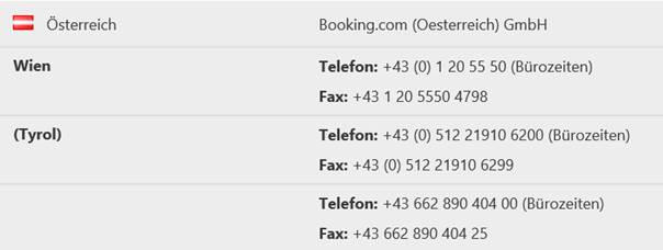 Booking.com informiert auf der eigenen Internetseite über die Möglichkeiten für die Anbieter von Unterkünften, mit ihnen in Kontakt zu treten. „Die Kontaktdaten unserer weltweit ansässigen Supportunternehmen sind ebenso unten aufgeführt.“[2] Hier die Kontaktdaten, die wir dort für Österreich finden:[3]