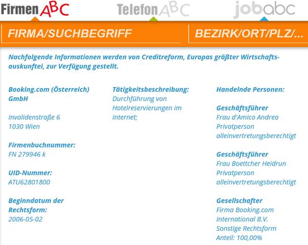 Im Internet kann man die Firma Booking.com (Österreich) GmbH schnell ausfindig machen:[4]