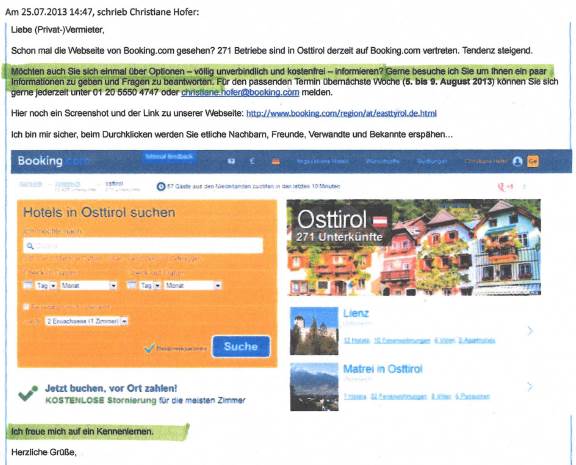 Die im Ausland tätigen „Supportunternehmer“ der Booking.com International B.V. – zu denen auch Booking.com (Österreich) GmbH gehört – bieten Beratung, Information und Hausbesuche an. Man kann dort sogar Verträge mit Booking.com unterzeichnen. Sie gehen aktiv auf Unternehmen und Privatpersonen zu und bieten aktiv die Dienste der Muttergesellschaft an. Hier ein Beispiel: