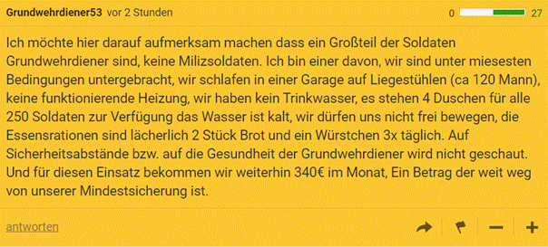 Der Kommentar eines Users beschreibt folgendes: „Ich möchte hier darauf aufmerksam machen dass ein Großteil der Soldaten Grundwehrdiener sind, keine Milizsoldaten. Ich bin einer davon, wir sind unter miesesten Bedingungen untergebracht, wir schlafen in einer Garage auf Liegestühlen (ca 120 Mann), keine funktionierende Heizung, wir haben kein Trinkwasser, es stehen 4 Duschen für alle 250 Soldaten zur Verfügung das Wasser ist kalt, wir dürfen uns nicht frei bewegen, die Essensrationen sind lächerlich 2 Stück Brot und ein Würstchen 3x täglich. Auf Sicherheitsabstände bzw. auf die Gesundheit der Grundwehrdiener wird nicht geschaut. Und für diesen Einsatz bekommen wir weiterhin 340€ im Monat, Ein Betrag der weit weg von unserer Mindestsicherung ist.“[1]