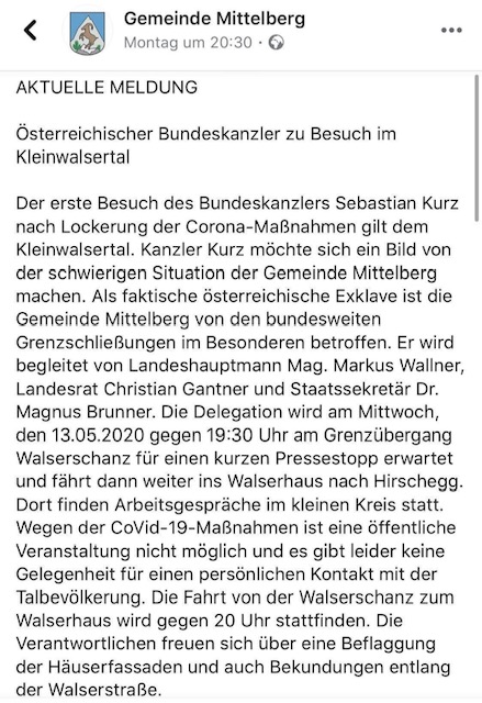 Am 13. Mai stattete der Bundeskanzler der Gemeinde Mittelberg im Kleinwalsertal einen Besuch ab. Bereits im Vorfeld gab es einen in den sozialen Medien einen Aufruf der Gemeinde, die Häuser zu beflaggen und bei Ankunft des Bundeskanzlers auch „Bekundungen entlang der Walserstraße“ durchzuführen. In dieser offiziellen Meldung der Gemeinde war über das Einhalten des Sicherheitsabstandes jedenfalls nichts zu lesen.
