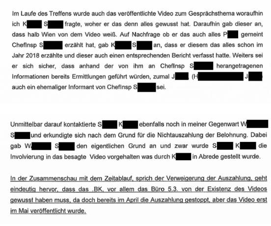 “Im Laufe des Treffens wurde auch das veröffentlichte Video zum Gesprächsthema woraufhin ich S. K. fragte, woher er das denn alles gewusst hat. Daraufhin gab dieser an, dass halb Wien von dem Video weiß. Auf Nachfrage ob er das auch alles P., gemeint Cheflnsp P. S, erzählt hat, gab S. K. an, dass er diesem das alles schon im Jahr 2018 erzählte und dieser auch einen entsprechenden Bericht verfasst hatte. Weiters sei er sich sicher, dass anhand der von ihm an Cheflnsp P. S. herangetragenen Informationen bereits Ermittlungen geführt würden, zumal der Ibiza-Detektiv auch ein ehemaliger Informant von Cheflnsp P. S. sei.”